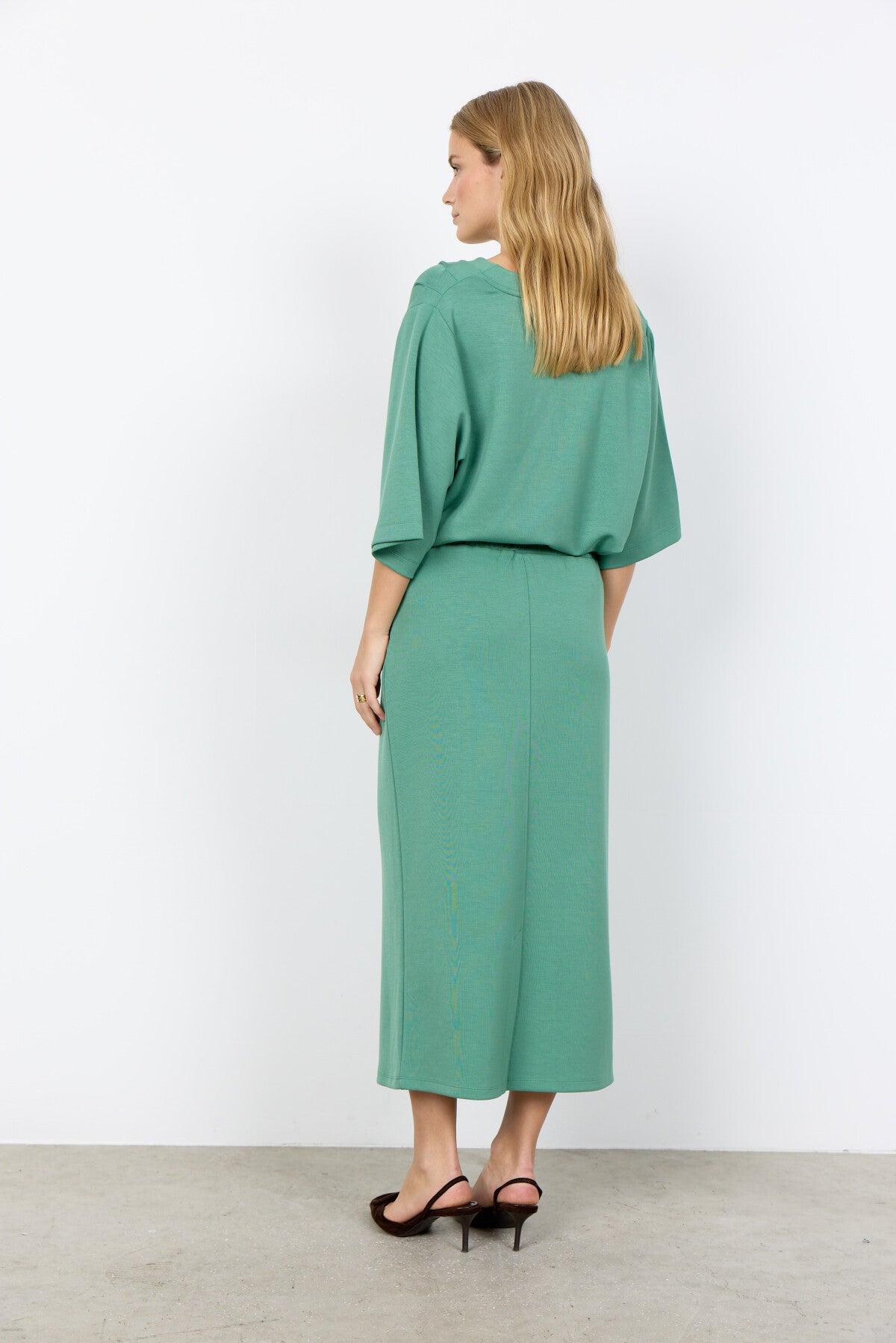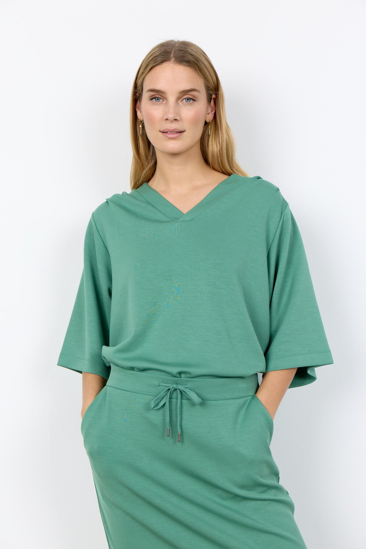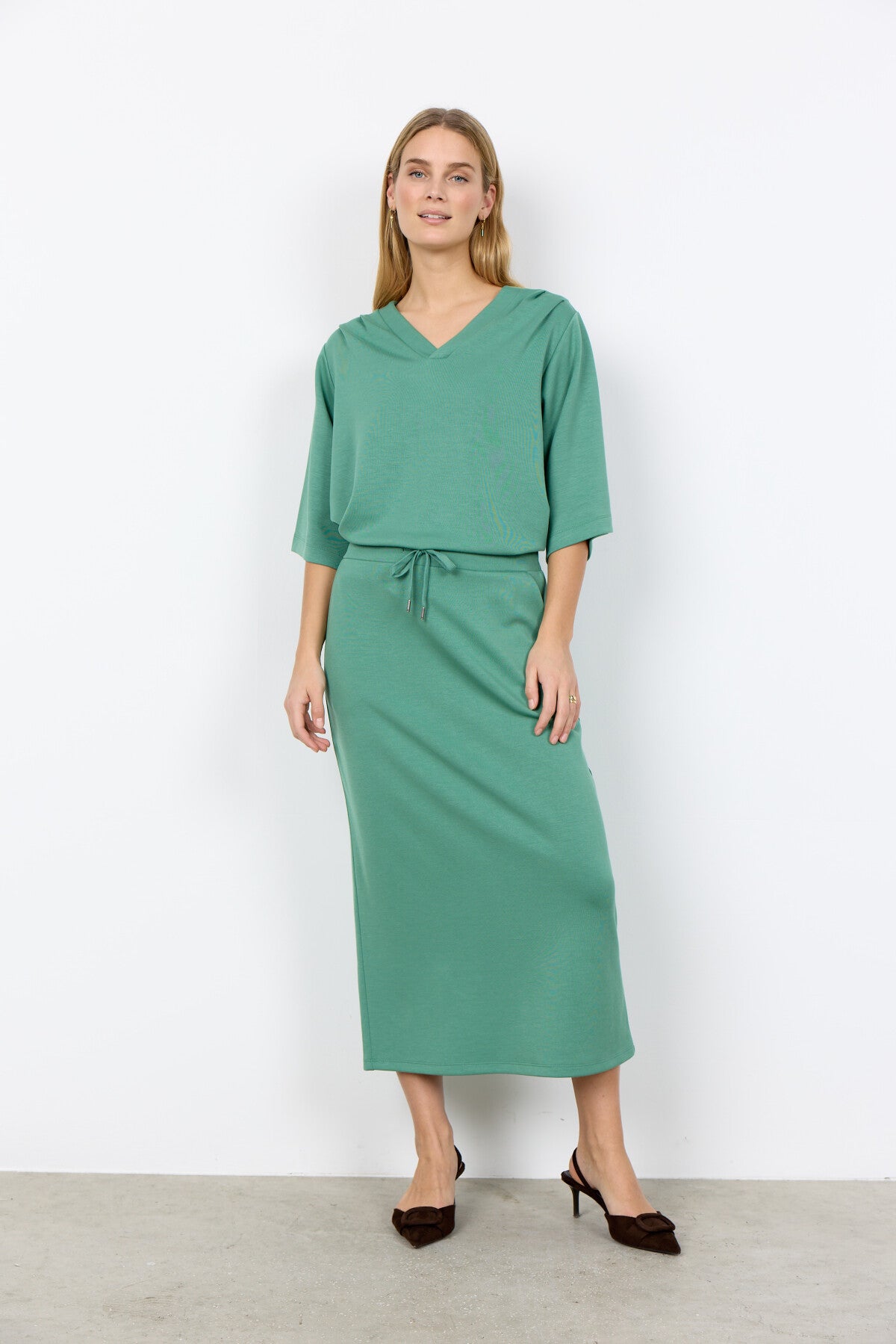SC-BANU 289 is a Blouse made of 48% Modal, 48% Polyester, 4% Elastane. It has a relaxed V-neck design with half sleeves and a smooth texture. Pair it with tailored trousers or a flowing skirt for an elegant look.