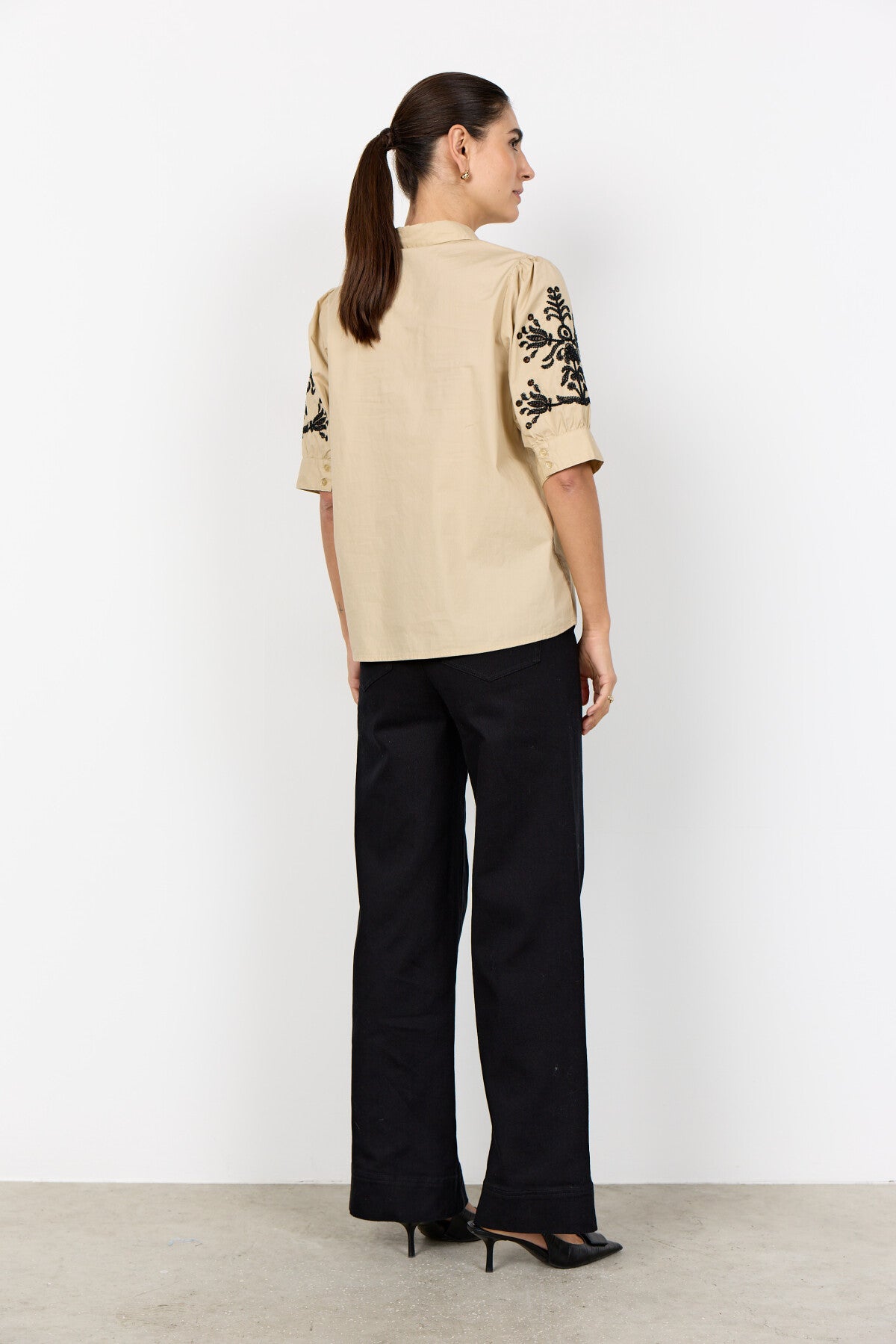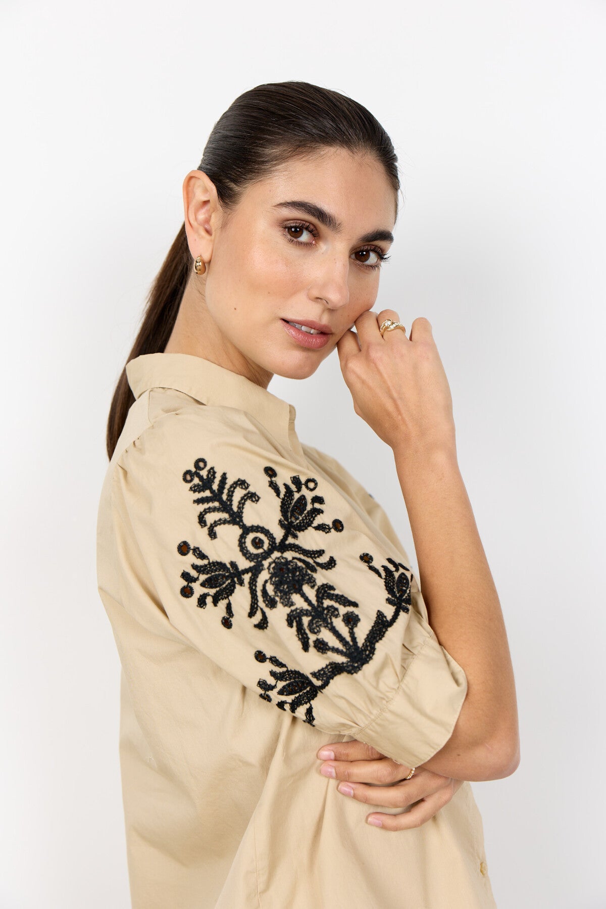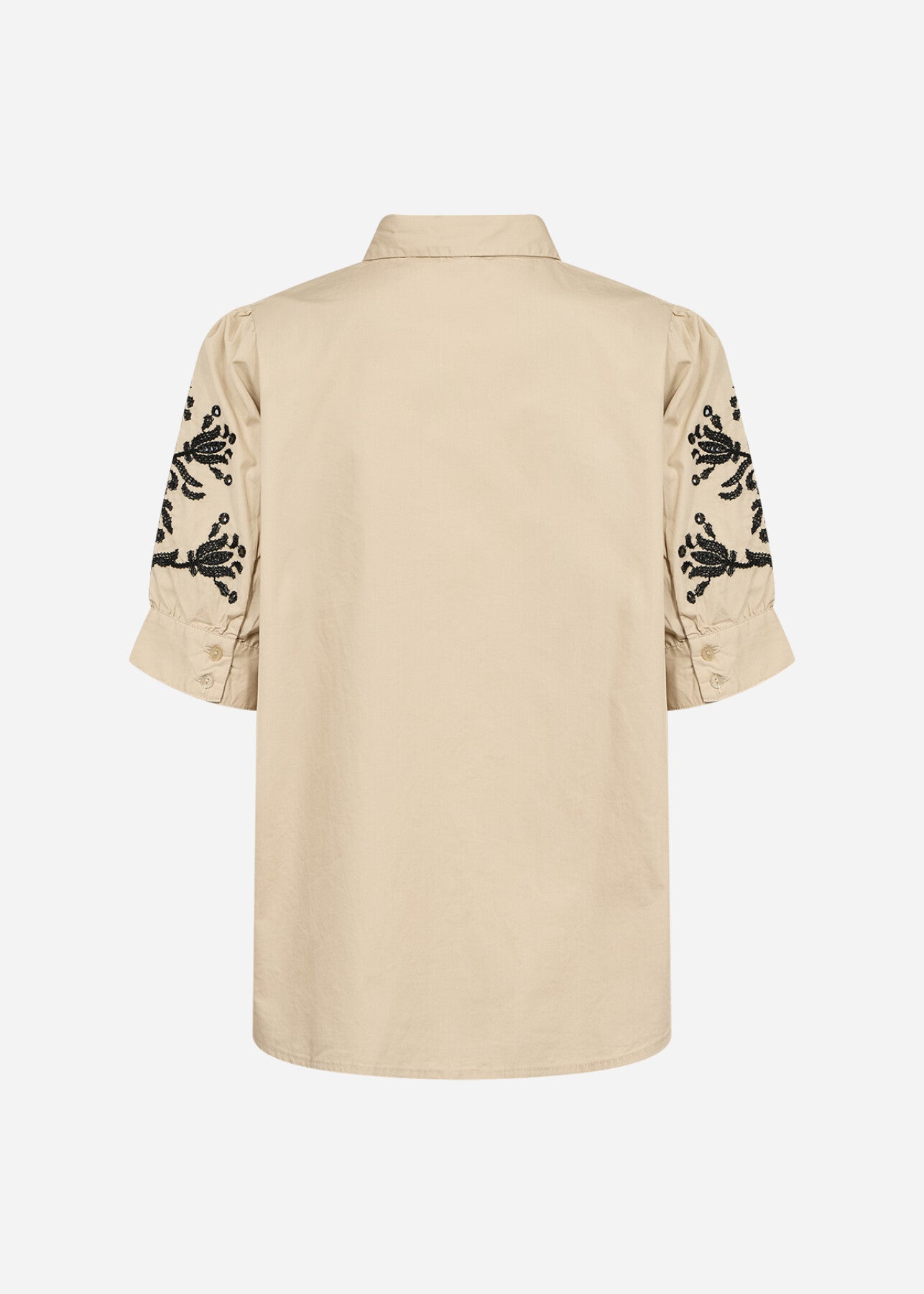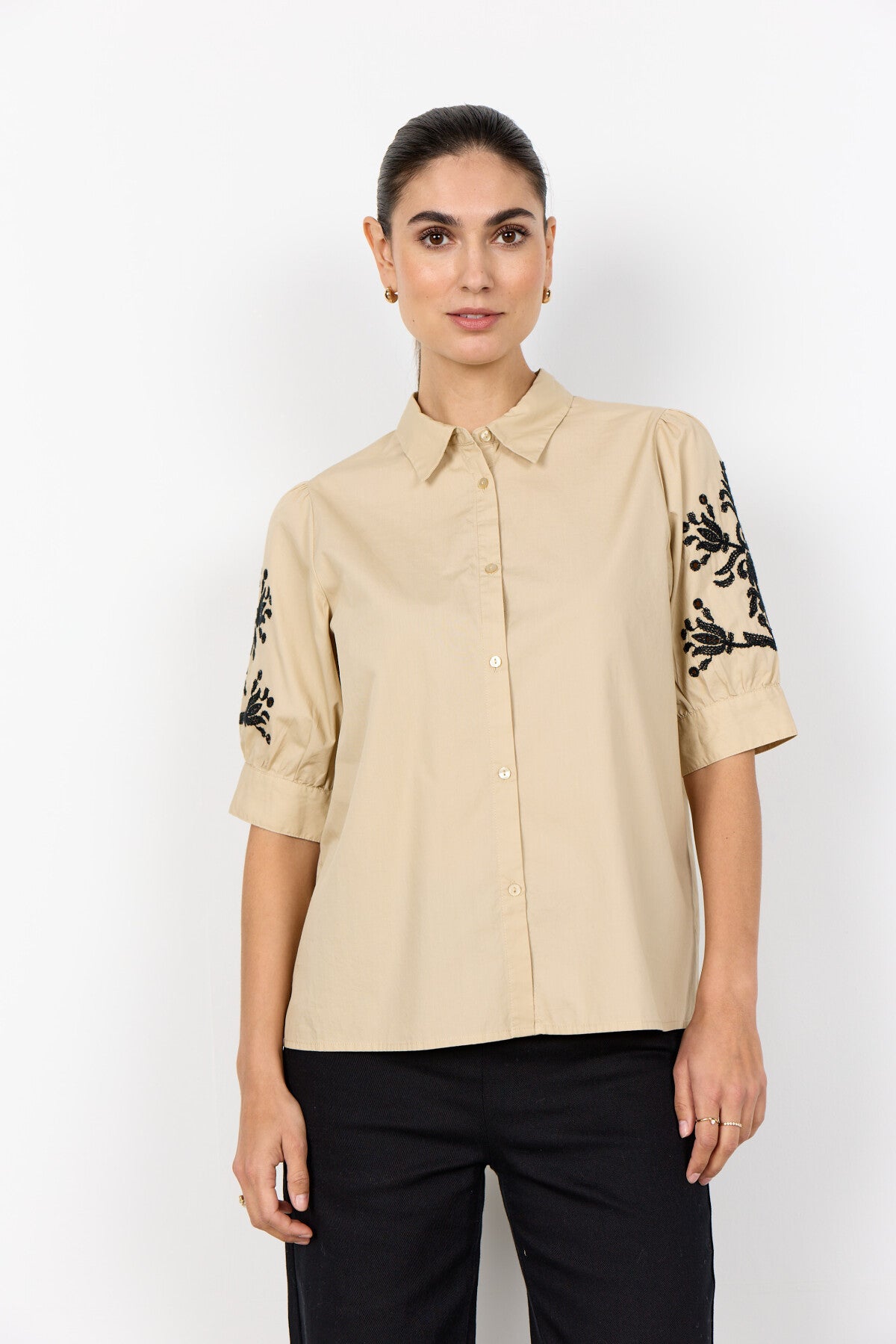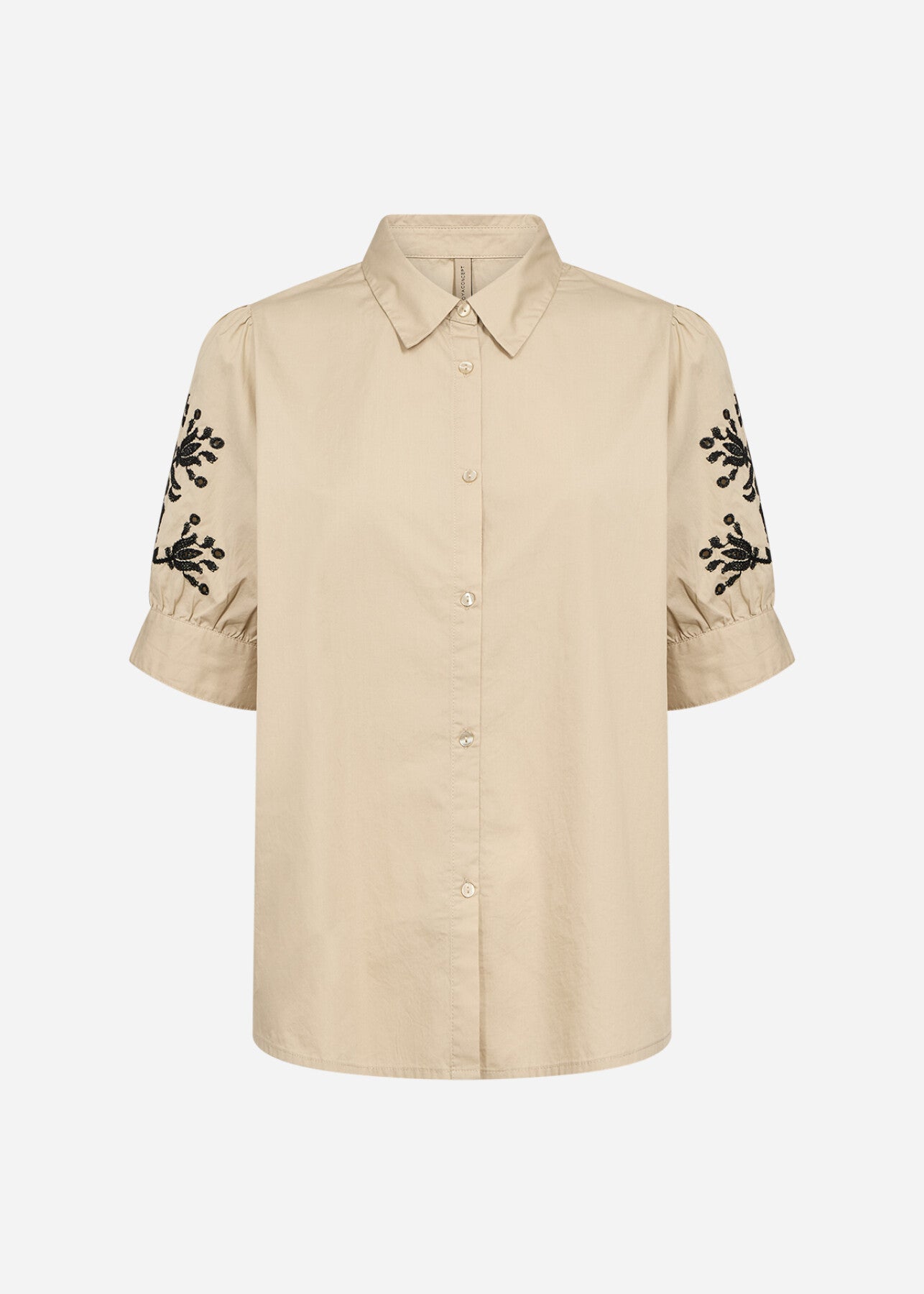 SC-MILLY 13 is a Shirt made from 100% organic cotton. The design features a classic collar, button-down front, and intricate embroidery on the puff sleeves. Style it with jeans for a casual look or pair it with tailored trousers for a more refined appearance.