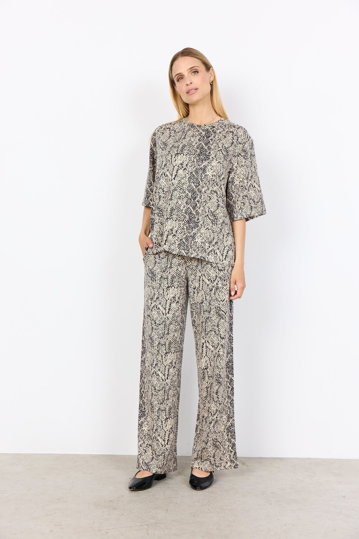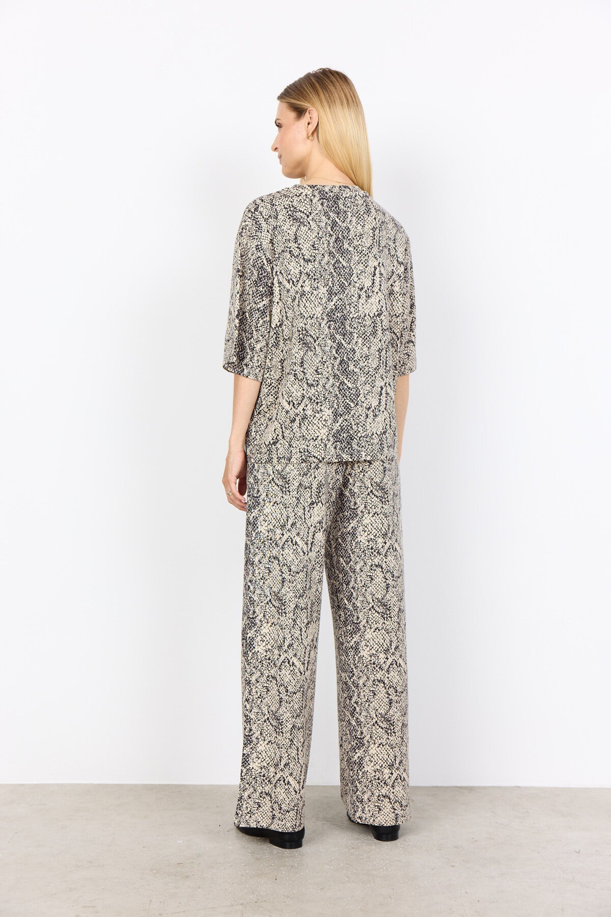 SC-VIOLET 1 is a T-shirt made from 75% Modal, 20% Polyester, and 5% Elastane. This T-shirt features a round neckline, short sleeves, and an all-over snakeskin print. Pair it with denim or tailored pants for a stylish look.
